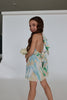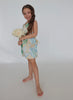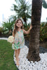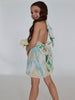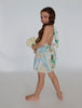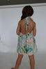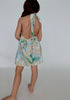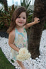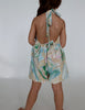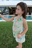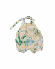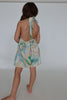 Becky,  a sweet bubble romper in soft painted leaf print.  Finished with a halter bow tie and gentle puffed silhouette — adorable, easy, and perfect for warm days.