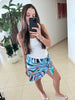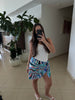 Bright and bold, the short sarong makes a statement with every step. Its abstract swirl pattern in aqua, salmon, azul rey hues wraps around effortlessly, tying at the hip for a flattering fit. Ideal for lounging poolside or night look.